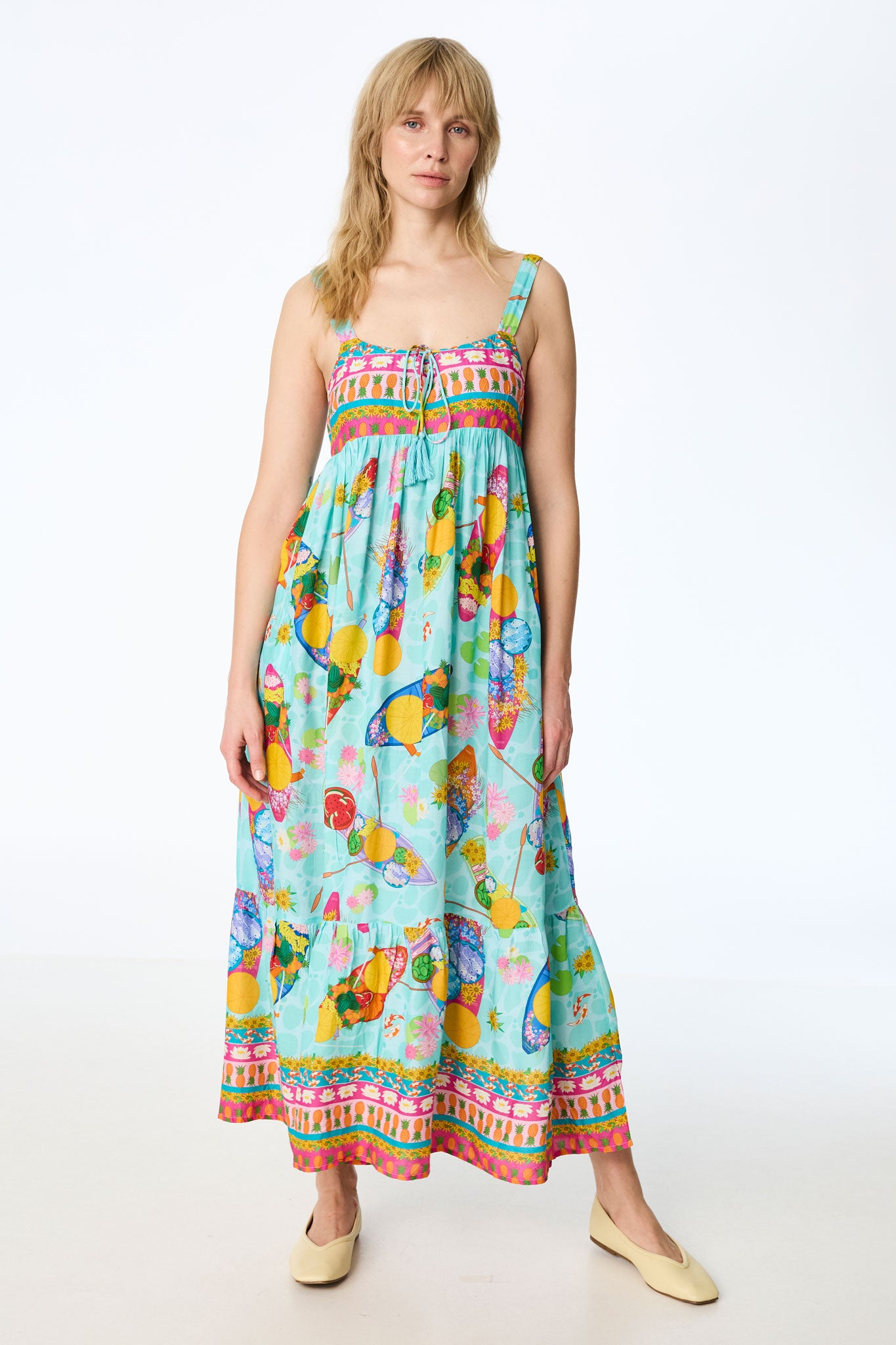 Das Design im klassischen Empire-Stil setzt durch die erhöhte Taillennaht feminine Akzente, während der weite Rockteil für eine luftige Silhouette sorgt. Für zusätzlichen Komfort und eine lässige Note sorgen die dezent in die Naht integrierten seitlichen Eingrifftaschen. Ein optisches Highlight ist der kunstvolle Print-Mix, der florale Elemente mit exotischen Motiven und grafischen Bordüren an den Abschlüssen kombiniert. Ein feines Bändchen am Dekolleté, das mit verspielten Tasseln versehen ist und sich zu einer zarten Schleife binden lässt, rundet den Look charmant ab. Ein ideales Stück für sonnige Tage, das pure Lebensfreude ausstrahlt.