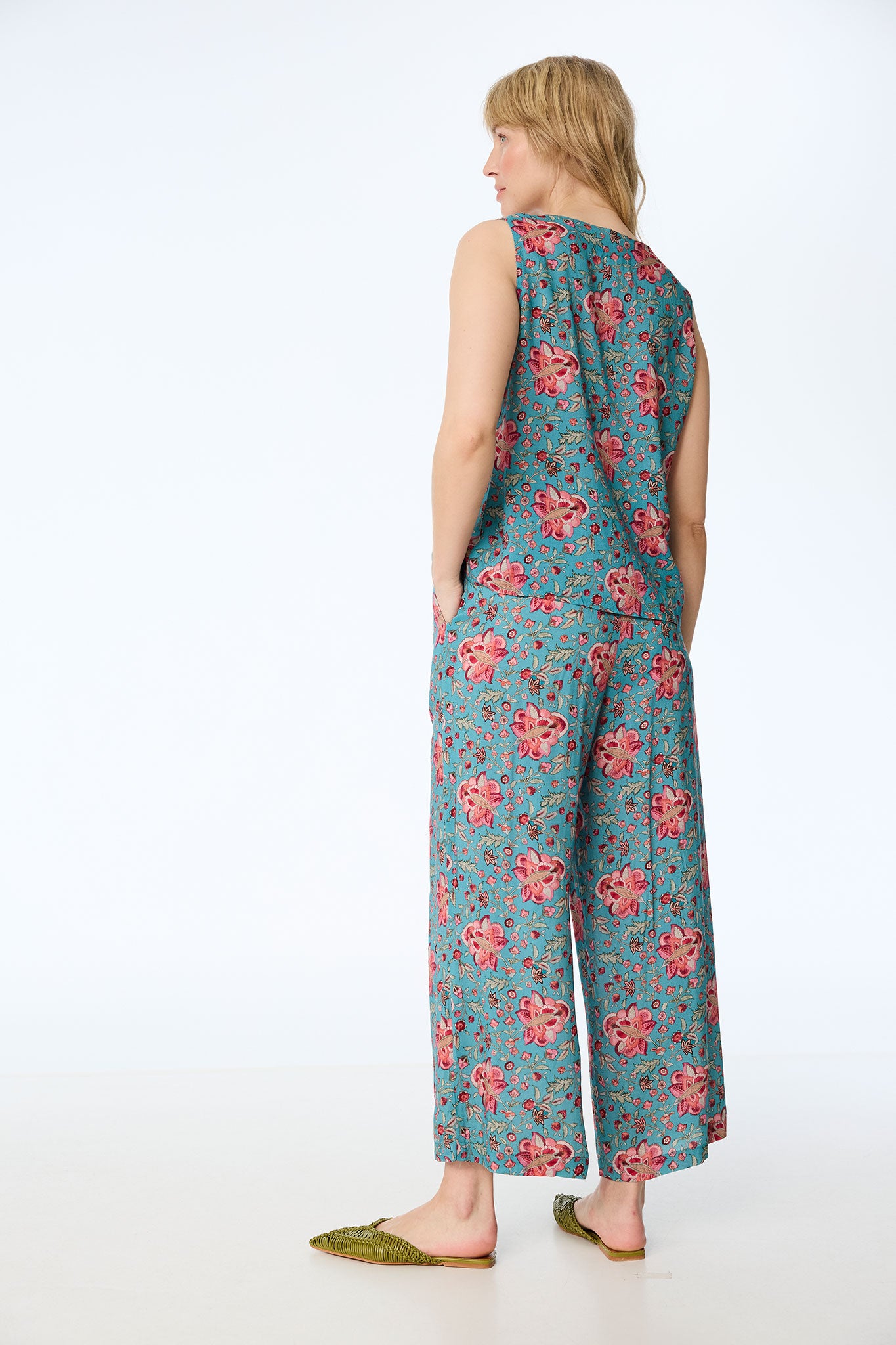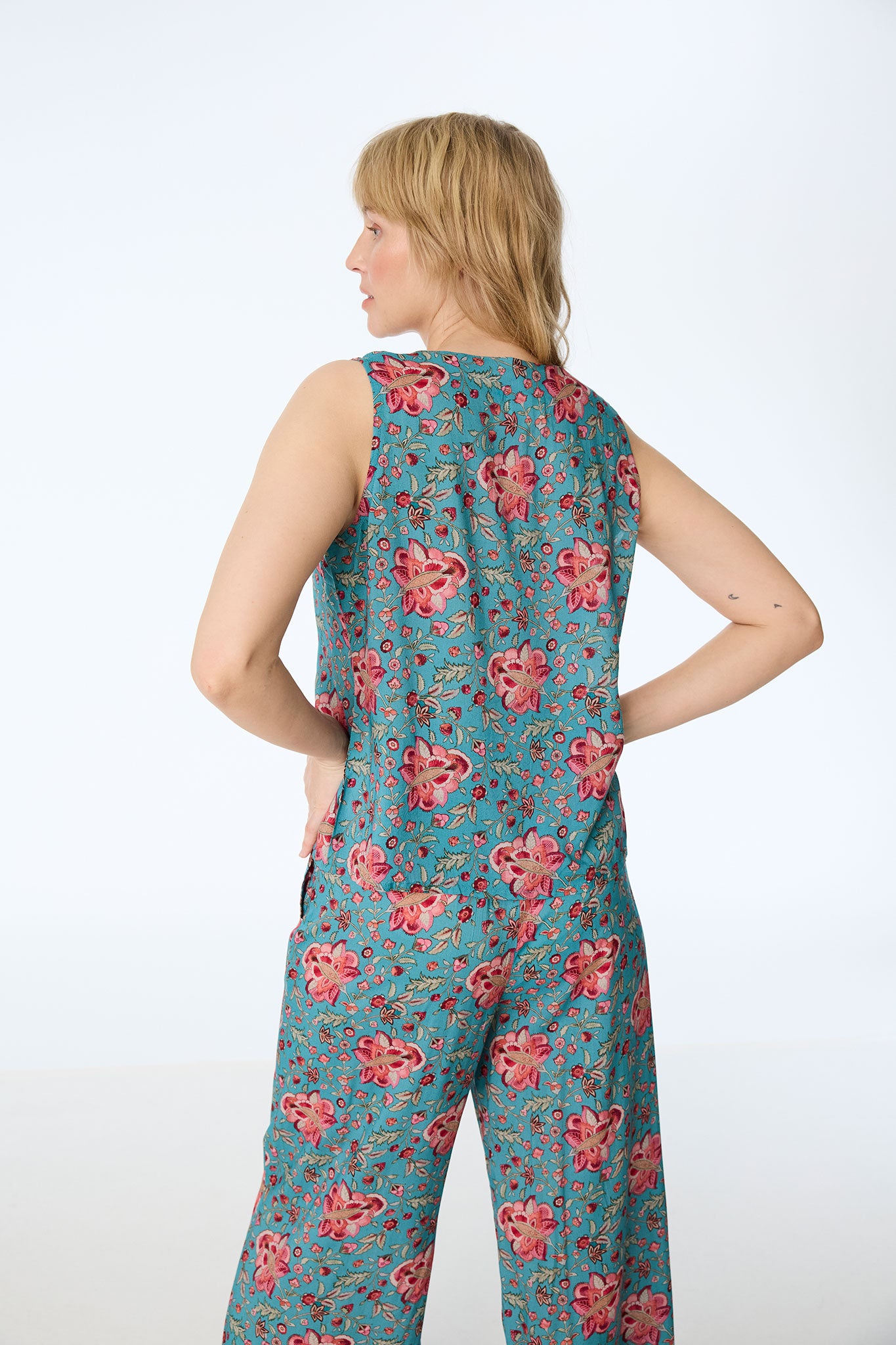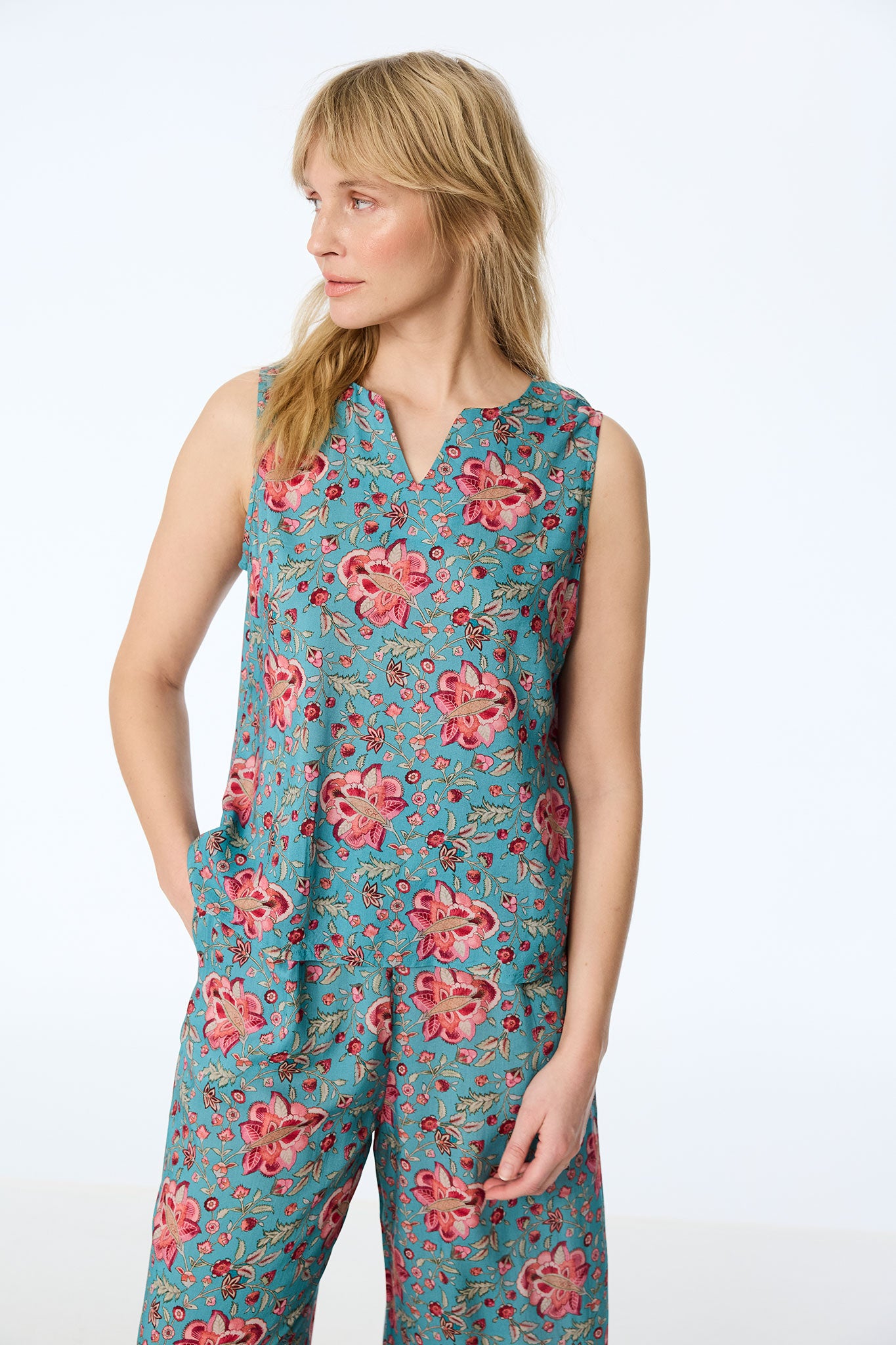 Leuchtende Farben und sommerliche Leichtigkeit vereinen sich in diesem ärmellosen Top, das durch sein prachtvolles Blütenmuster in Türkis und Koralle sofort gute Laune verbreitet. Gefertigt aus 100% Modal (Viskose), besticht das Material durch einen besonders weichen, fließenden Fall und schenkt Ihnen an warmen Tagen ein angenehm luftiges Tragegefühl. Der Stoff schmiegt sich sanft an die Silhouette an, ohne einzuengen, und sorgt für eine feminine Leichtigkeit.